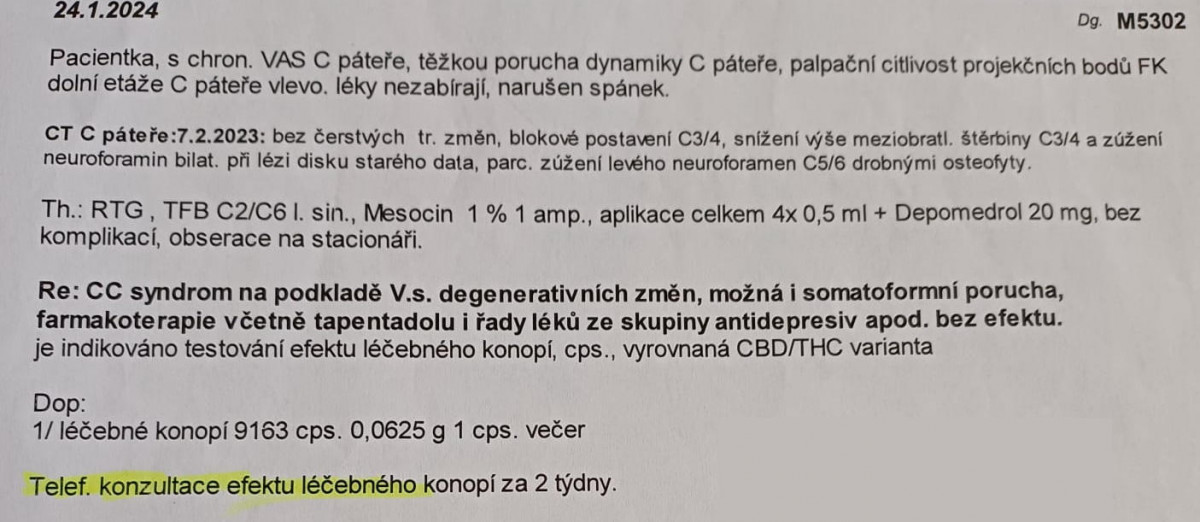 Vhodné je zhodnocení předchozí terapie psychofarmakoterapie/terapie bolesti, zda nebyla léčba poddávkována (např. pregabalin, ev. změna na gabapentin) nebo podávána jen po velmi krátkou dobu. Opioidy byly bez efektu, tedy tam se nemá smysl vracet, osud úvodní dávky vyrovnané varianty CBD/THC léčebného konopí je nejasný. Lokální terapie C páteře v ambulanci bolesti, změna RHB.