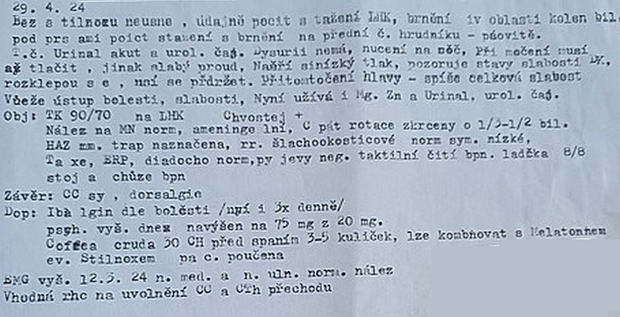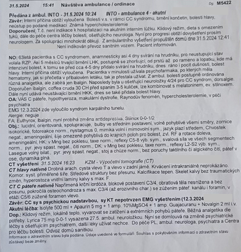 Před 20ti měsíci si nyní 63letá pacientka začala stěžovat na bolesti krční páteře vystřelující do hlavy, různých intenzit, bolesti hlavy zpočátku občasné, nyní bolest trvá stále, 24 h denně. Farmakoterapie včetně tapentadolu a i léků ze skupiny antidepresiv bez efektu. Rehabilitace, obstřik páteře bez také bez efektu. Zhoršení psych. stavu, infekce močových cest. Pacientka uvádí také zvýšenou citlivost na změnu počasí. V říjnu 2023 se spustilo brnění levé ruky, která je nyní již téměř nefunkční, pravá zatím částečně funkční. Brnění pociťuje v celém těle, stalo se nyní dominantní bolestí. Mění se jí i vnímání horkosti a chladu, doteku těla. Prosím o konzultaci dalšího postupu terapie, přikládám zprávy z vyšetření. Děkuji.